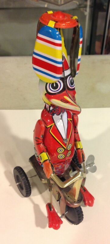 Title (ebay affiliate link): VINTAGE WIND UP TIN TOY "DUCK ON A BIKE" WITH SPINNING HAT.