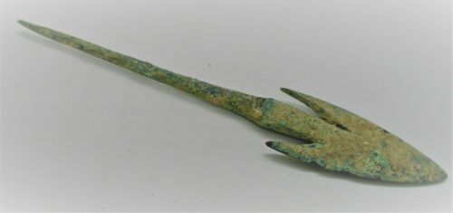 CIRCA 1500 BCE ANCIENT MYCENAEAN BRONZE LONGSHOT BARBED ARROWHEAD