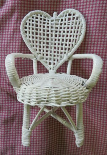 Title (ebay affiliate link): Vintage Doll White Wicker Chair Heart-Shaped Back 9" Tall Very Good Condition