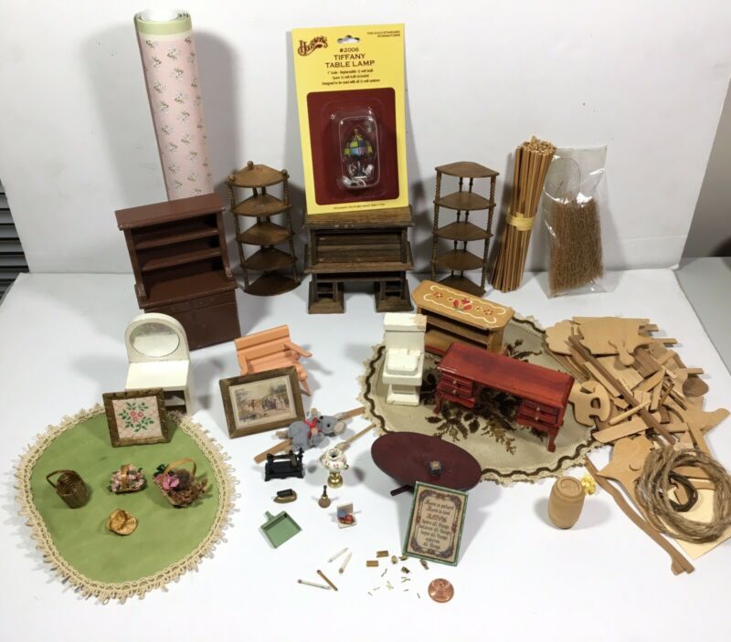 Vintage Lot Wood Doll House Furniture & Metal Accessories