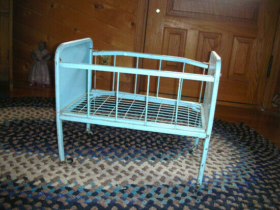 Title (ebay affiliate link): Vintage Blue Metal "Doll-E-Crib" by Amsco Adjustable Side Rail Bed 1950s