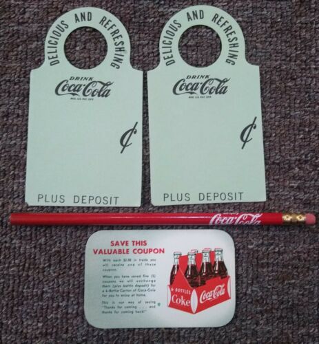 Title (ebay affiliate link): Four 1950s COCA-COLA ITEMS....COUPON, PENCIL & BOTTLE HANGERS.....NOS & MINT!