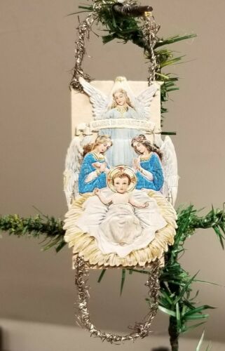 Title (ebay affiliate link): Three Angels with Jesus. Early 1900s Miniature Paper & Tinsel Xmas Orn. German