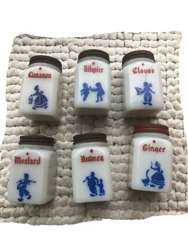 VINTAGE SET OF 6 MILK GLASs DUTCH THEME SPICE JARS - SHAKERS