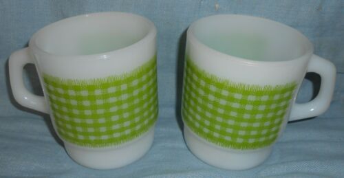 2 Vintage Anchor Hocking Fire-King Gingham Green Plaid Milk Glass Cups Mugs