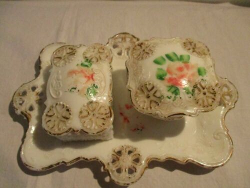 Vtg victorian? art deco? white (milk?) glass dresser tray & 2 covered pieces "U"