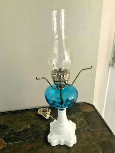 Title (ebay affiliate link): ANTIQUE MILK GLASS BASE & CLEAR OCEAN BLUE GLASS OIL LAMP (ELECTRIFIED)