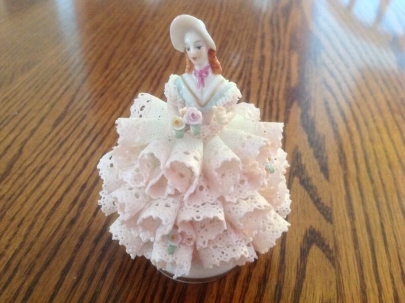 Irish Dresden ''Sylvia'' Porcelain Figurine Lace Pink Green 3.75"