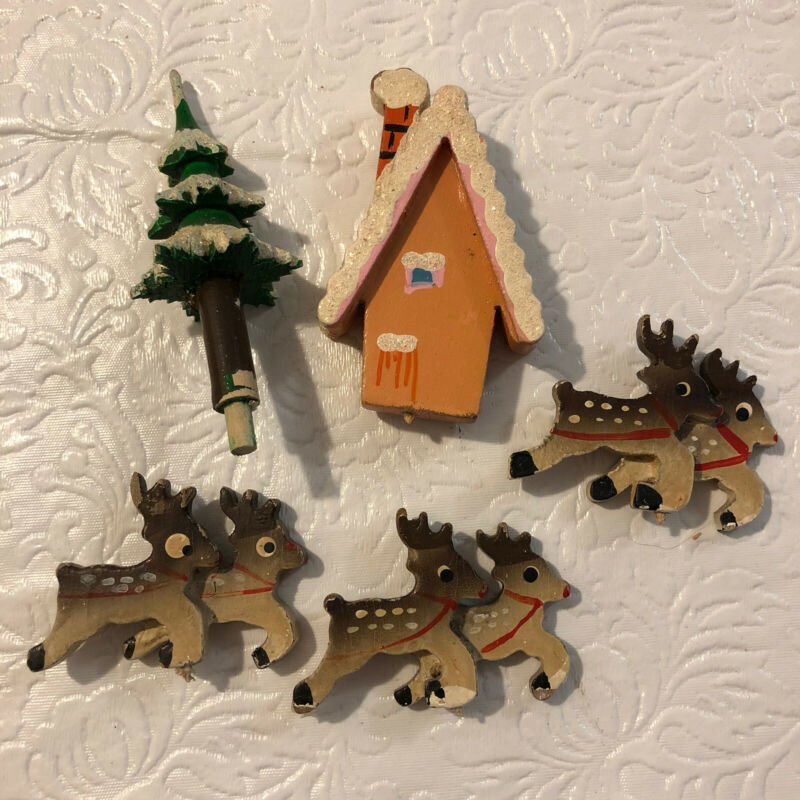 Vtg Folk Art Erzgebirge Miniature Christmas Figures (Cottage Reindeer Tree)