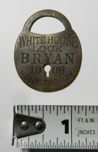 Title (ebay affiliate link): 1908 BRYAN PRESIDENTIAL CANDIDATE WHITE HOUSE LOCK HOLDS THE KEY BRASS FOB