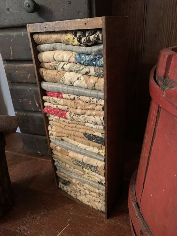 Title (ebay affiliate link): 5 Lb Wooden Cheese Box W/ Early Brown Calicos & Blue Homespun Quilt Scrapes