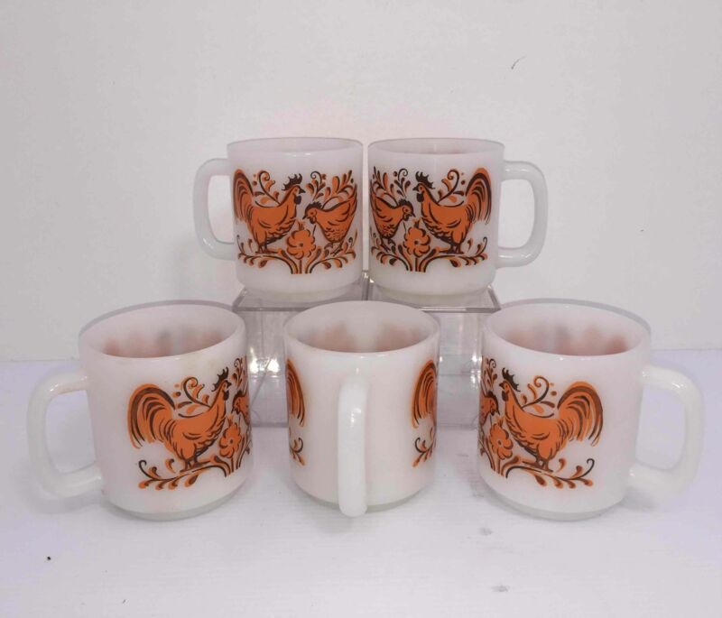 5 Retro Glasbake Milk Glass Heat Resistant Rooster Hen Coffee Mugs