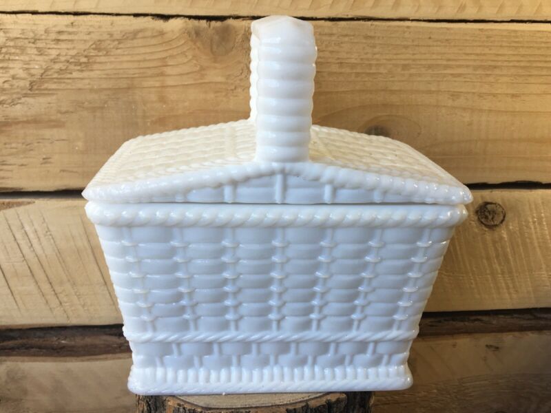 Title (ebay affiliate link): Vintage Westmoreland Milk Glass Covered Picnic Basket Candy or Trinket Dish