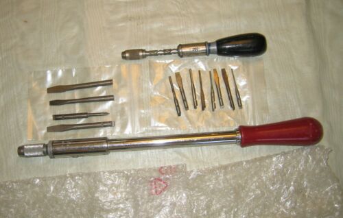 TWO VINTAGE SPIRAL RACHET SCREW DRIVERS WITH 12 BITS. YANKEE AND STEELCRAFT. EXC