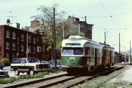 Title (ebay affiliate link): MBTA PCC car 3173, Beacon St., Boston MA, May 8, 1982 Original slide