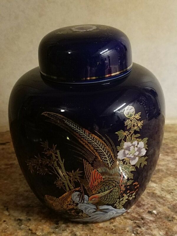 Title (ebay affiliate link): Cobalt Blue Porcelain Lidded Ginger Jar with Gold and white garden scene