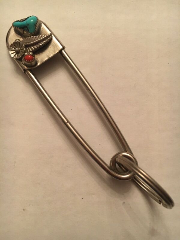 Title (ebay affiliate link): Vintage Genuine TURQUOISE & CORAL RISDON Key Tag Chain Holder Giant Safety Pin