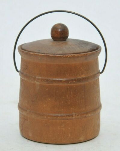 NICE SMALL ANTIQUE WOOD JAR with LID AND WIRE HANDLE