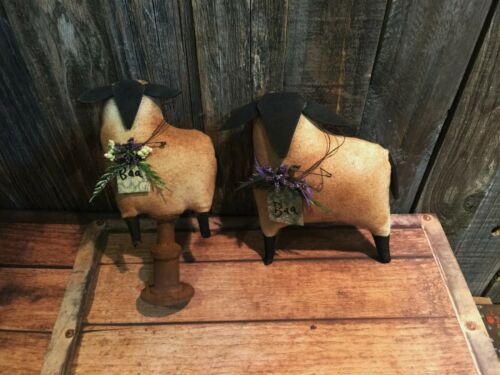 *Primitive SET OF 2 SHEEP BOBBIN SITTER FABRIC HANDMADE Country old rusty doll*