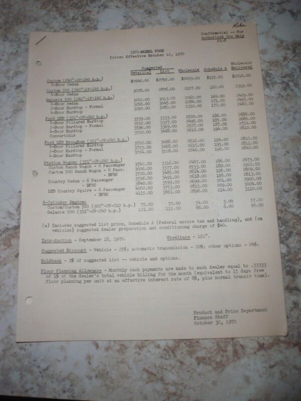 Title (ebay affiliate link): CONFIDENTIAL/AUTHORIZED ONLY, PRICES for 1971 MODEL FORDS, MUSTANG, T-BIRD/MORE