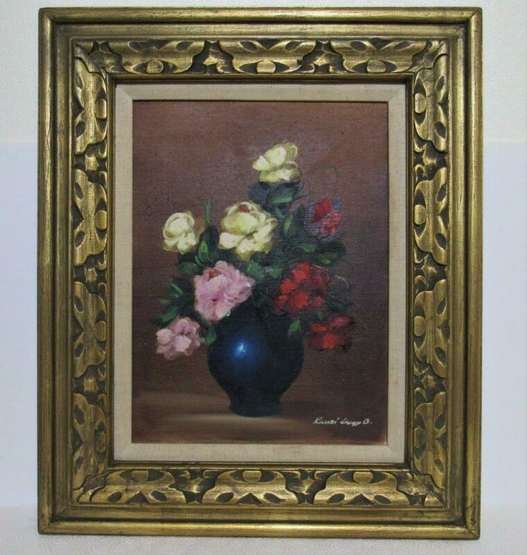 floral still life oil painting in vintage carved wooden picture frame solid wood