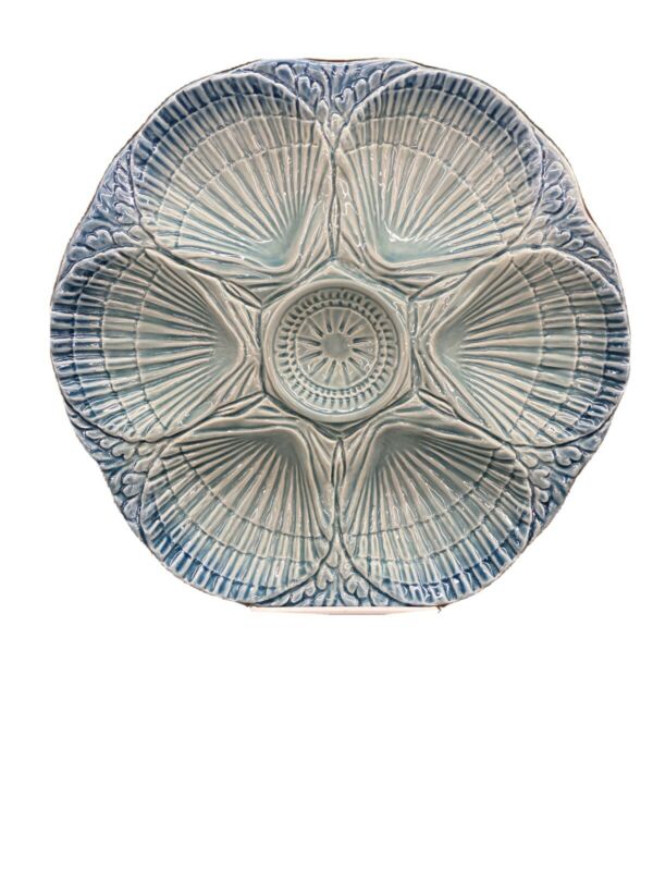 Majolica Hand Painted Oyster Plate With Six Wells Blue And Red