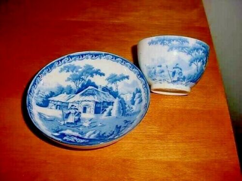 Title (ebay affiliate link): EARLY 1800''S STAFFORDSHIRE TRANSFER HANDLESS CUP & SAUCER DARK BLUE COTTAGE