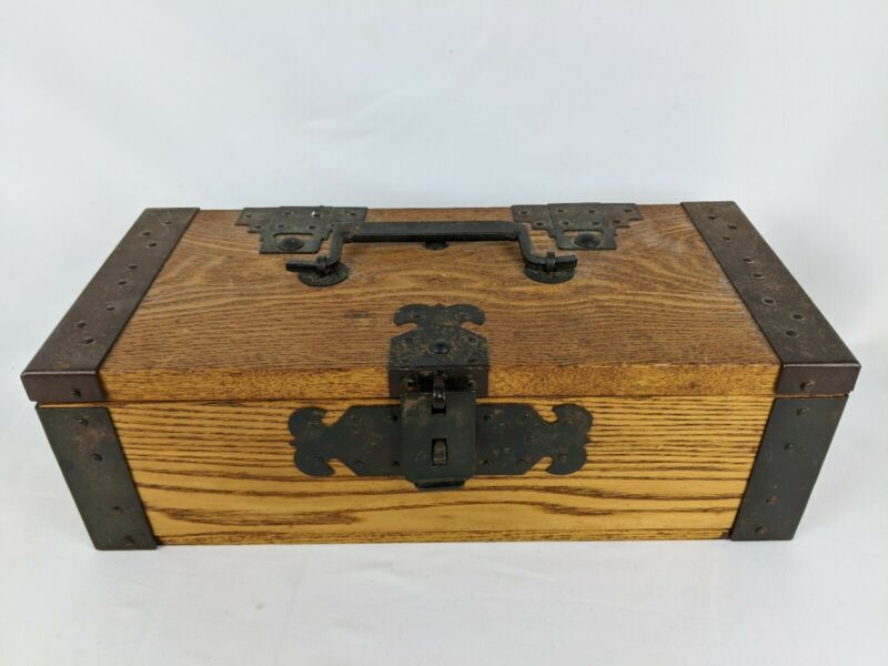 Vintage Wooden Trinket Box Chest Iron Accents Handle & Clasp Wood Case 13" x 6"