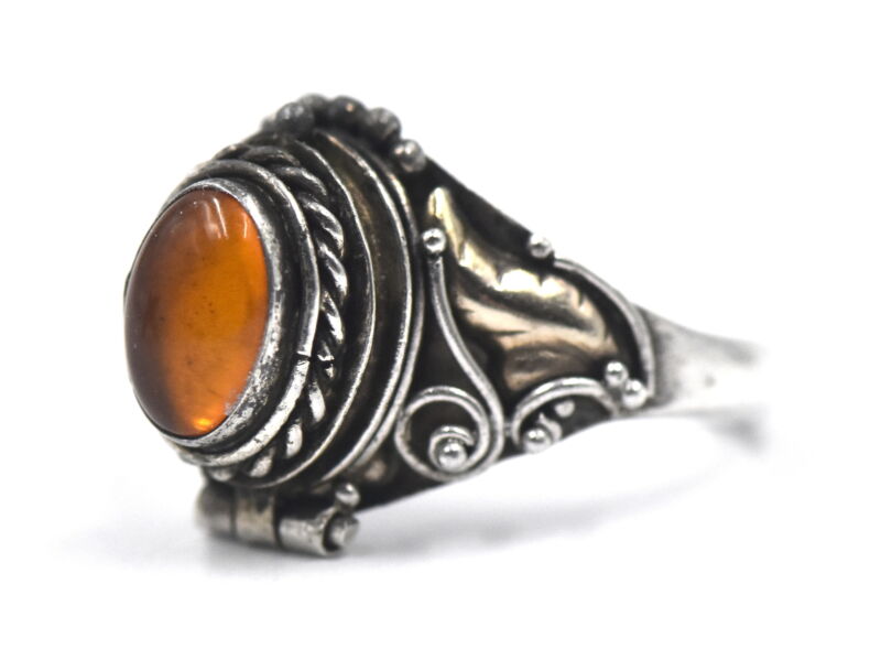 ANTIQUE VICTORIAN AMBER POISON RING FANCY SCROLL DESIGN STERLING SILVER SIZE 4