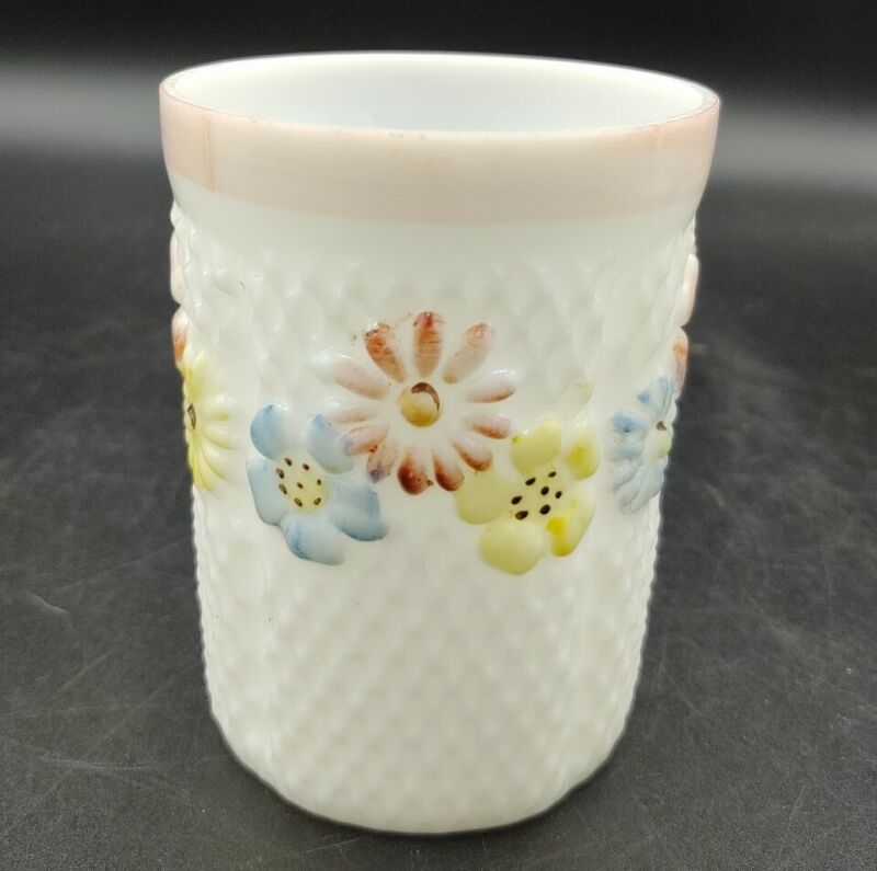 Antique Milk Glass Cosmos Daisy Floral Lattice Drinking Cup Tumbler AS IS