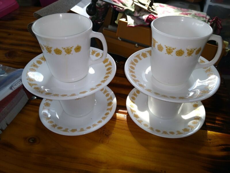 -8 pc-Pyrex Corelle Corning BUTTERFLY GOLD Coffee Mugs Cups & saucers milk glass