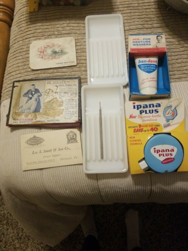 Antique DENTAL LOT Milk Glass Trays Products Post Cards NOS dentist