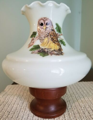 Title (ebay affiliate link): Vintage Milk Glass Hurricane Lamp 9 1/2" - Painted Owl - 4" Wood Base