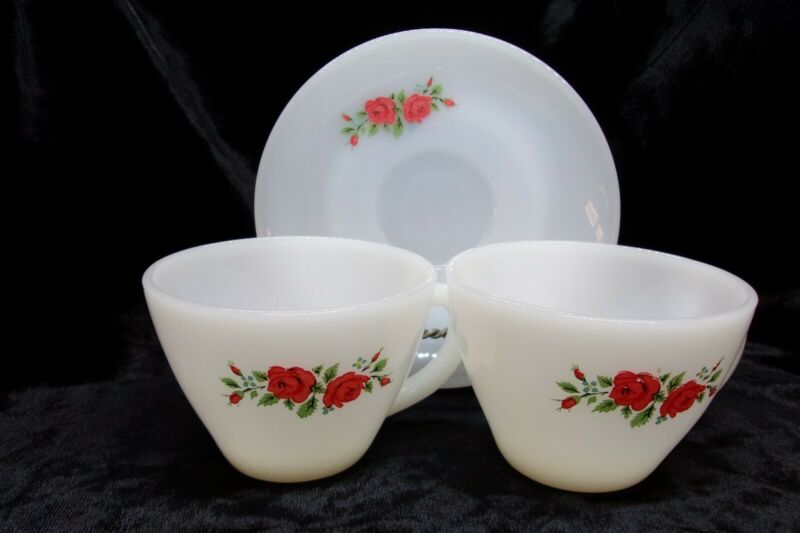 Vintage Red Rose Fire King Milk Glass 2 cups 1 saucer