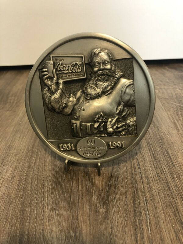 Title (ebay affiliate link): 1991 Coca-Cola Pewter 60th Anniversary Santa Claus Medallion with Stand