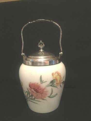 Title (ebay affiliate link): Antique Victorian White Glass Biscuit Jar Hand Painted Flowers CF Monroe