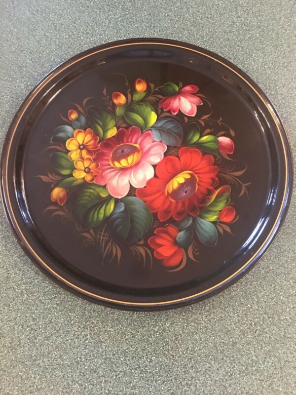 VINTAGE BLACK ROUND TOLEWARE PLATTER EUC RUSSIAN MARKINGS Floral Hand painted
