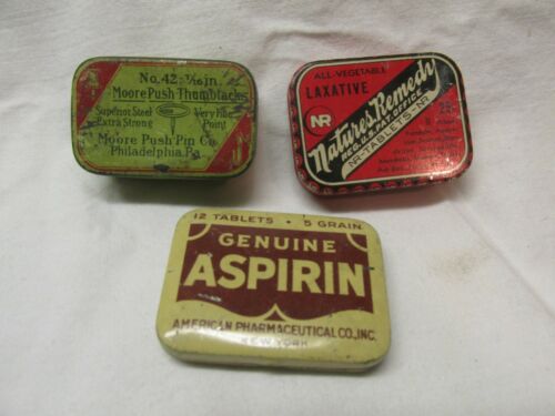 Title (ebay affiliate link): Tins medicine American Pharm aspirin, Natures Remedy Laxative, Moore push pins