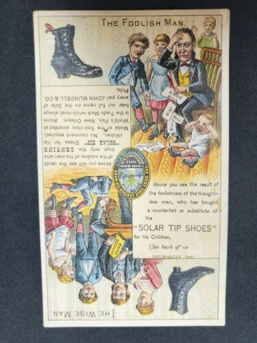 Antique Trade Card SOLAR TIP SHOES, J MUNDRELL CO, PORTLAND ME, WISE / FOOLISH