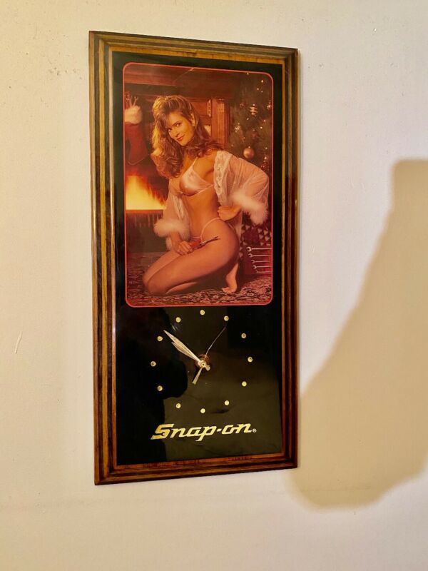 Title (ebay affiliate link): VINTAGE SNAP-ON CHRISTMAS PINUP CLOCK 80''s Man Cave, Brunette Kneeling NR!