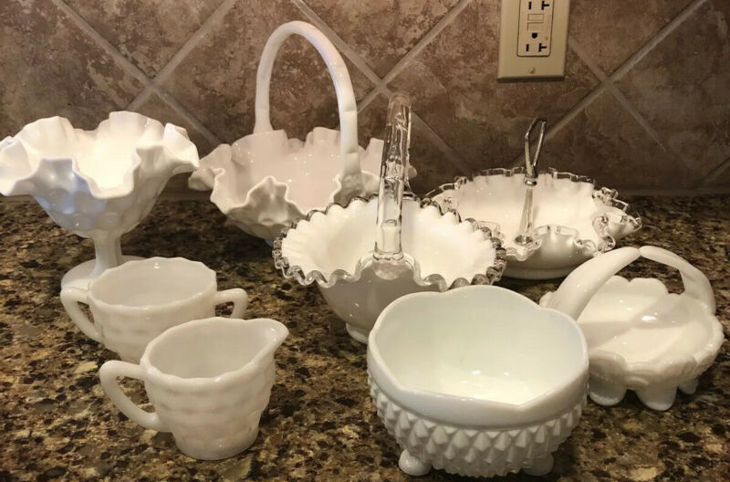 Title (ebay affiliate link): Vintage 8 Pc Lot Random Milk Glass. Candy Dishes, Various Baskets, Cream/sugar