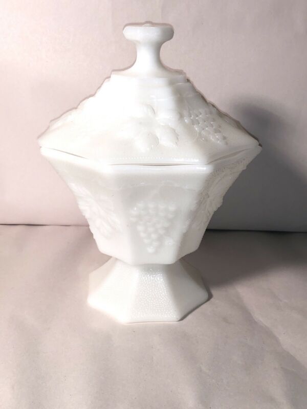 Vintage Anchor Hocking milk glass lidded compote/candy dish grape panel octagon