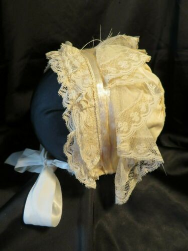 Title (ebay affiliate link): Antique Vintage Cotton Doll Bonnet w Lace and Silk Ties ~ 14" ~