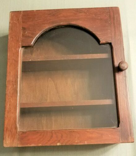 Title (ebay affiliate link): VINTAGE WALL MOUNTED SMALL 3 SHELF WOOD CABINET WITH DOOR. FULL OF CHARACTER