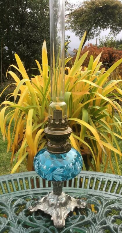 Stunning Victorian Kingfisher Blue With Enamelled Painting Peg Lamp.