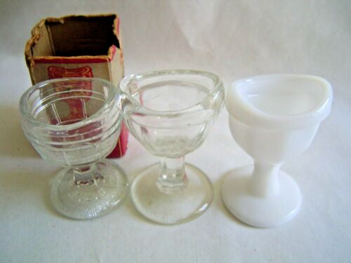 Title (ebay affiliate link): LOT OF 3 VINTAGE GLASS PEDESTAL EYE WASH CUPS 2 CLEAR 1 MILK GLASS