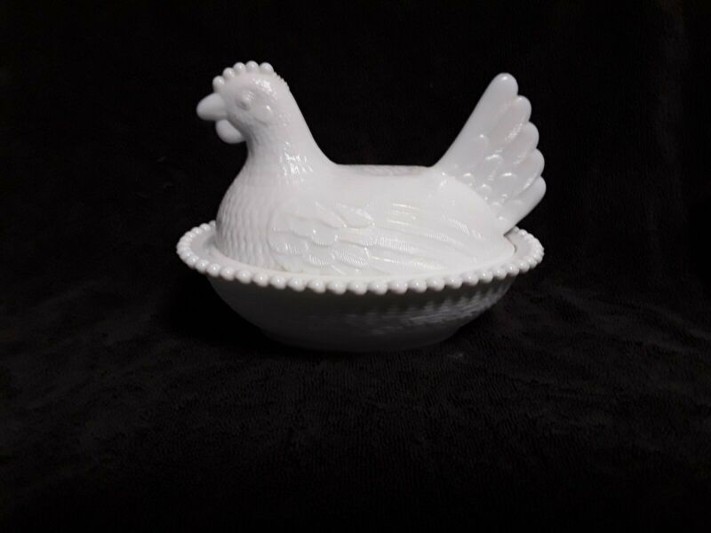 Vintage Indiana White Milk Glass Hen on a Nest Chicken in a Basket