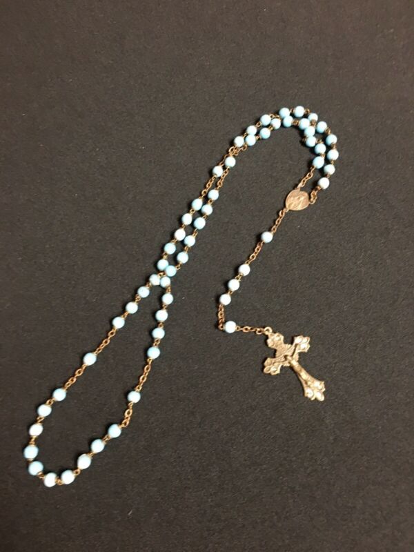 Vintage antique Blue milk glass seed beads Rosary crucifix brass chain