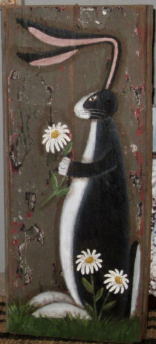 *~*PRIMITIVE*~* HP FOLK ART PRIM BLACK & WHITE BUNNY * DAISY *~* RECLAIMED WOOD