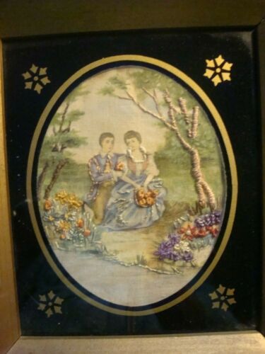 Title (ebay affiliate link): OLD PICTURE ON CLOTH PAINTED AND EMBROIDERED LOVING COUPLE IN GARDEN